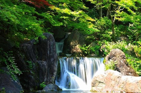 日本庭院中對水的處理是千變萬化,往往利用高差將瀑布引入水池,然后引向溪水,再引到水池的一邊串組合。通常,池的水源多用瀑布,瀑布分一段落下,以及分二、三段落下,修筑瀑布落水時要產生聲音也是很講究技巧的。日本古代將瀑布按水落的形態(tài)分為十種,即片落、湍落、布落、院落、重落、對落、側落、棱落、離落、向落。瀑布在日本庭院中被廣泛使用,它使庭院產生了虛實變化,大大豐富了庭院空間。