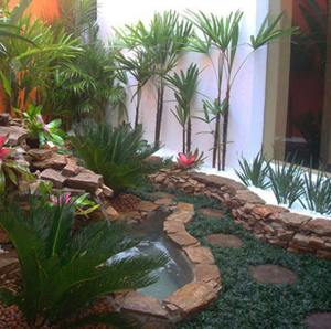 由假山和植物構(gòu)建而成的園林,給人帶來了熱帶雨林的感覺,鮮艷的花朵搭配濃濃的綠,好一幅絕美景致。