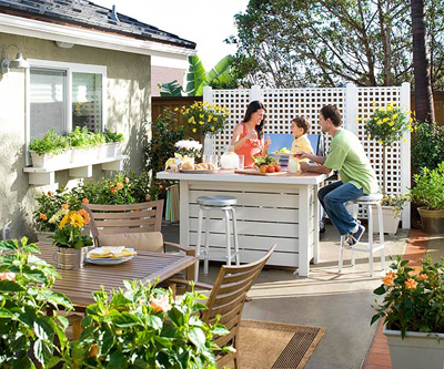 利用高的網(wǎng)格狀物來建立天井周邊的一個(gè)溫和邊界,這是一個(gè)非常不錯(cuò)的方法。如果想為花的成長提供足夠大的生長空間,那要選擇一個(gè)適合的地方,例如在陽光充足的條件下種植葡萄。待葡萄開花之時(shí),迷人的芬芳?xì)馕稉湎蚵啡?,是個(gè)不錯(cuò)的選擇。