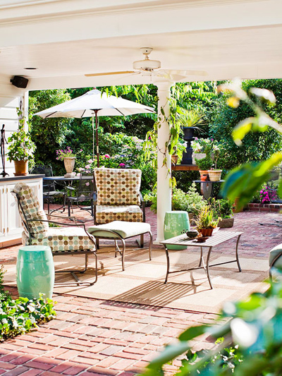 天井,本來能起到庇護(hù)的原理作用,不幸的是,卻擋住了夏天冷卻的微風(fēng)。如果你有一個(gè)開放式的結(jié)構(gòu)——一個(gè)真正的屋頂或棚架,你可以在其頂上設(shè)置一個(gè)吊扇,它可以幫忙降低高達(dá)10度的溫度。在吊扇邊裝一盞燈,還將有一個(gè)可靠的架空照明光源。