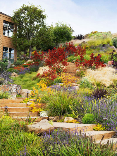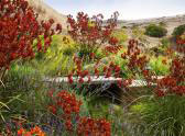 如此美麗的港灣全景會(huì)引領(lǐng)著住戶繼續(xù)深入,沿著一條陡峭的坡道到達(dá)住宅。住宅旁邊是一片公共區(qū)域,這里是一片大面積的草地。實(shí)際上,在該住宅施工階段的初期,構(gòu)筑物的基坑建造地不太合理,導(dǎo)致防水性不強(qiáng),橫向坡度的梯度也失去了它本身的作用,最終使住宅的下層區(qū)域不是那么堅(jiān)固穩(wěn)定,從而對(duì)整個(gè)住宅本身都有損害。多年以后,這些損害被人們重新發(fā)現(xiàn),該設(shè)計(jì)團(tuán)隊(duì)希望對(duì)一些不合理的地方進(jìn)行改造,重新修復(fù)排水系統(tǒng)中存在的一些問題,并對(duì)修復(fù)的地基做好保護(hù)工作,為整個(gè)家庭創(chuàng)造一個(gè)可使用的空間。該設(shè)計(jì)團(tuán)隊(duì)對(duì)整個(gè)場(chǎng)地作為了一個(gè)總體規(guī)劃,他們?cè)O(shè)計(jì)了一個(gè)形狀彎曲的沼澤地,沼澤地覆蓋了斜坡,這樣的設(shè)計(jì)也切斷了橫向流動(dòng)的水流,將之引向住宅,從而創(chuàng)造了一條浪漫的人行小路,沿著小路可以到達(dá)一個(gè)隨意休閑的座位區(qū),途中還會(huì)經(jīng)過一個(gè)池水區(qū)。場(chǎng)地中還種有許多植物,它們皆來自加利福尼亞當(dāng)?shù)?,所有的植物都處在低水位的地區(qū),抗旱能力很強(qiáng)。
