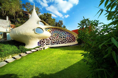 下面這座“鸚鵡螺”式的房屋位于墨西哥的Naucalpan,由建筑事務(wù)所設(shè)計(jì),建成于2006年,客戶(hù)是一對(duì)有兩個(gè)孩子的年輕夫婦。他們厭倦了傳統(tǒng)的住宅,希望能夠擁有一座融入大自然的住房。房子所在處的地勢(shì)向上,南邊、北邊和東邊都是高樓大廈,西邊則可以一覽廣闊的群山。經(jīng)過(guò)無(wú)數(shù)次修改后,形成了一個(gè)鸚鵡螺式的結(jié)構(gòu)。居住在其中似乎像蝸牛一樣,從一個(gè)房間緩慢移動(dòng)到另一個(gè)房間,頗似共生的化石住所。住宅中沒(méi)有任何劃分,在三維的和諧空間中你會(huì)發(fā)現(xiàn)第四維的動(dòng)感,從樓梯盤(pán)旋而下的時(shí)候感覺(jué)就像軟體動(dòng)物趴在植被上。